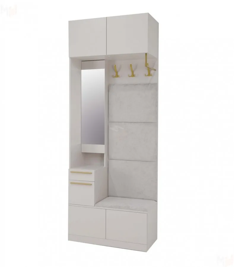 Модуль включает в себя элегантное зеркало с фацетом, удобный ящик для мелочей, отделения для обуви и мягкие элементы, чтобы создать идеальное пространство для вашей прихожей. -
