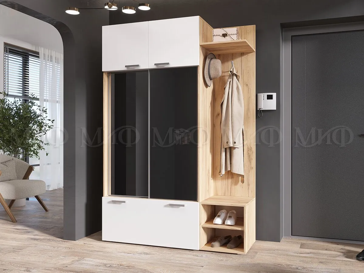 «Стелла» — удобная и вместительная прихожая в стиле лофт. Она имеет зеркальный шкаф-купе в алюминиевом профиле, обувницу, антресоль, вешалку для одежды. Материал: ЛДСП дуб крафт/белый глянец.