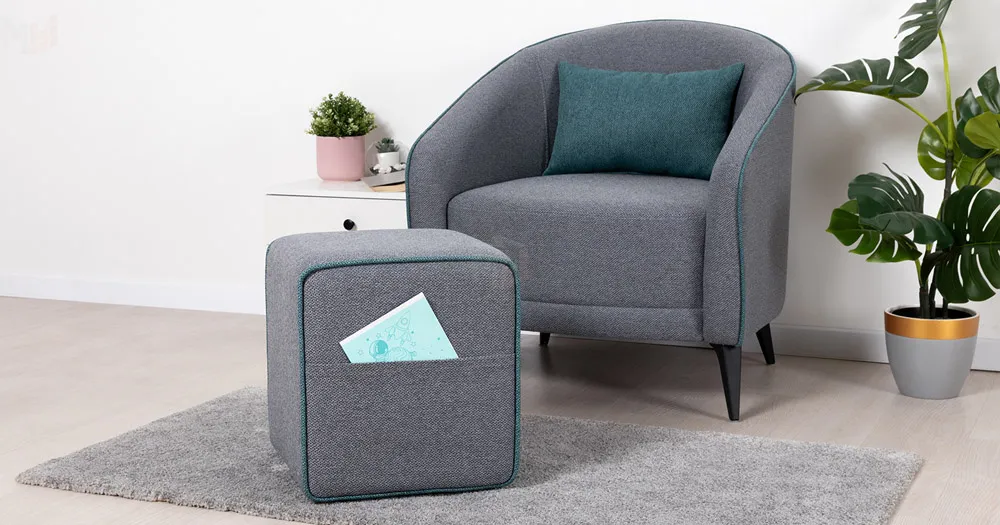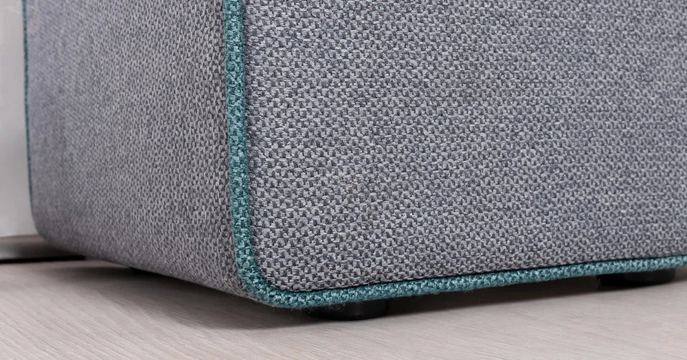 Боковые карманы на противоположных сторонах пуфа, два противоположных торца оформлены контрастным кантом