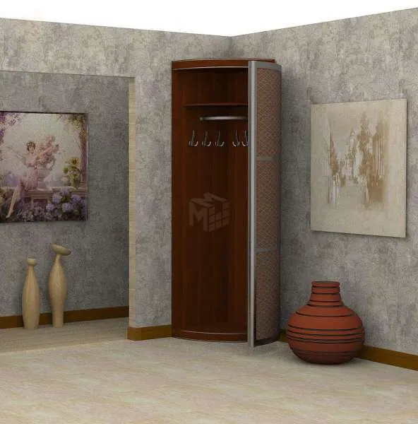 Это стильная оригинальная мебель, которая может использоваться как в сочетании с другими радиусными шкафами, так и отдельно. Отличительной особенностью модели является ее конструкция, которая, во-первых, угловая, что позволяет рационально использовать угловое пространство комнаты. Во-вторых, элемент имеет небольшие габариты по ширине, но при этом, за счет использования верхней площади комнаты, обладает высокой вместимостью. И, в-третьих, выпуклая распашная дверь модели увеличивает внутренний объем шкафа и делает мебель более креативной.