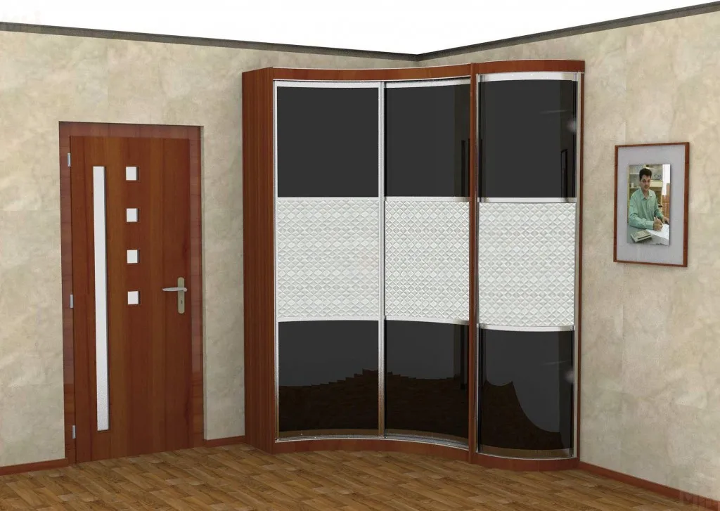Радиусный шкаф-купе РАДИОН оснащен штангами для коротких и длинных вещей, 2 выдвижными ящиками, выдвижной вешалкой и полками, наверху вместительная антресольная полка.