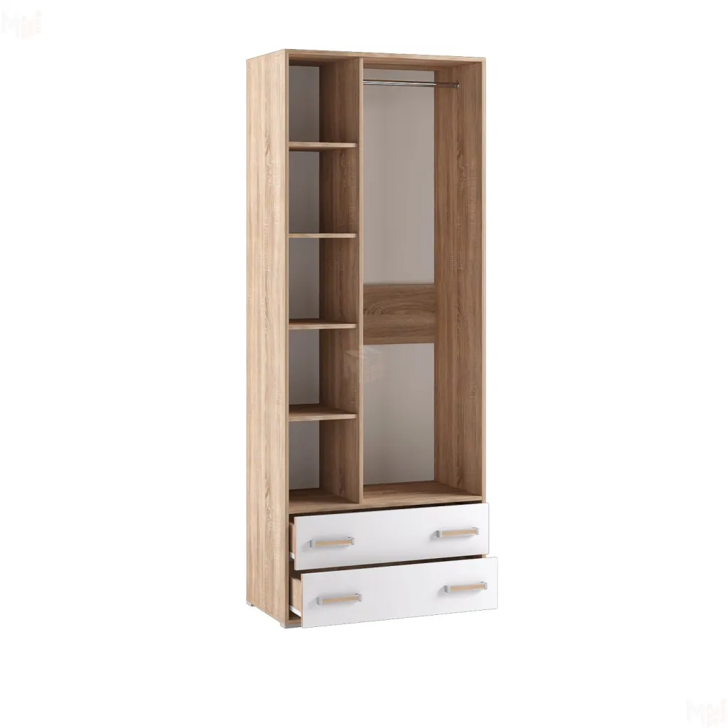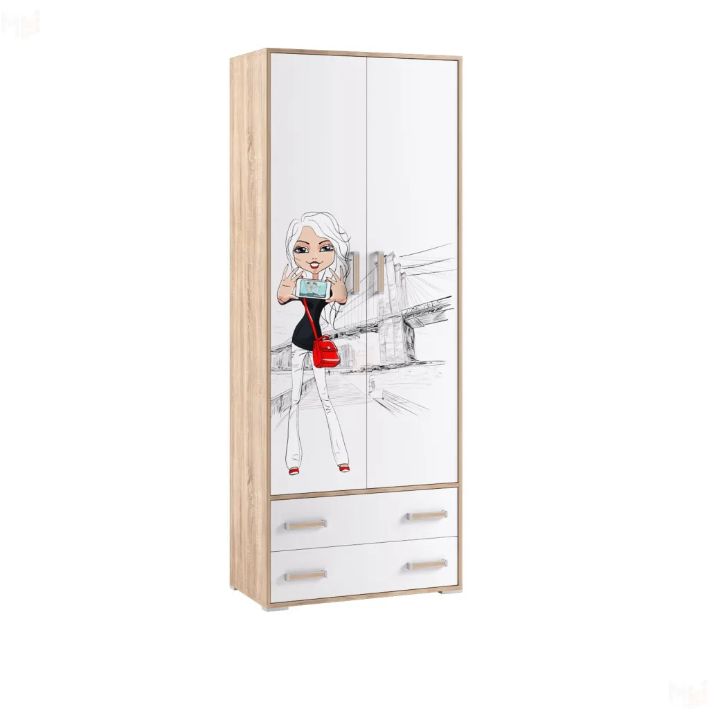Шкаф 2-х дверный Бланка станет замечательным дополнением интерьера детской комнаты. За распашными дверьми находится вместительное пространство, созданное для хранения гардероба. Широкая штанга предназначена для вешалок-плечиков со школьными костюмами и красивыми платьями, а боковые полки и два выдвижных ящика - для белья, аксессуаров и коробок с обувью. -