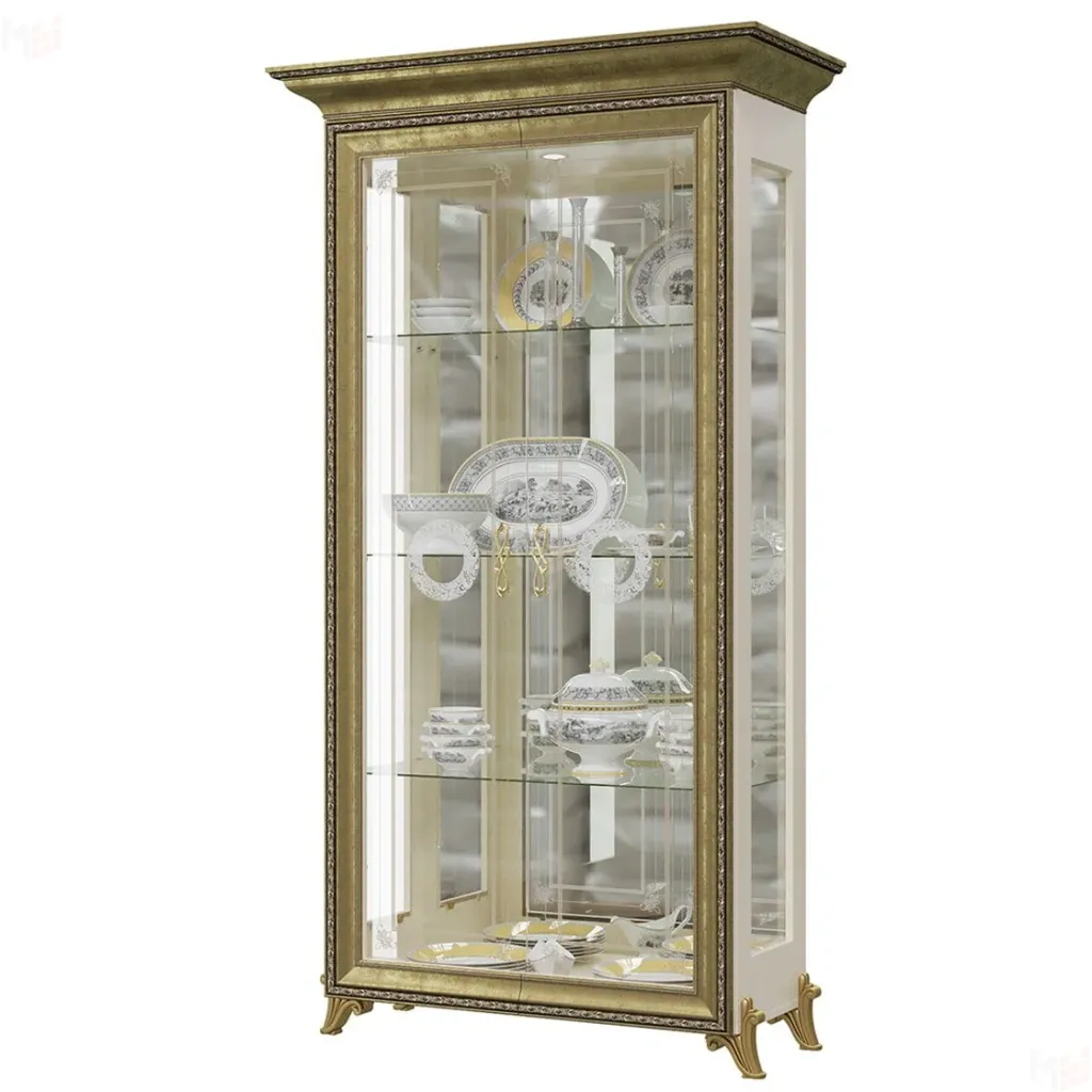 Шкаф с стеклянными дверками, боковыми вставками и 3 полками, в обрамлении богатой рамки фасада, выглядит воздушным и сказочно красивым.