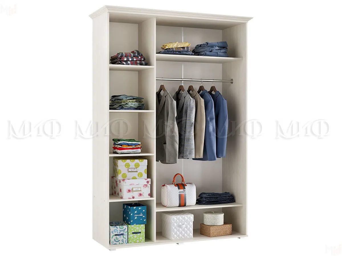 Наполнение шкафа - слева секция с полками для белья, справа отделение со штангой для верхней одежды, полка в верхней и нижней части шкафа.