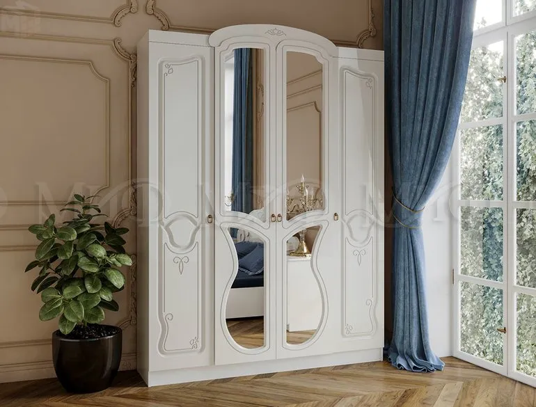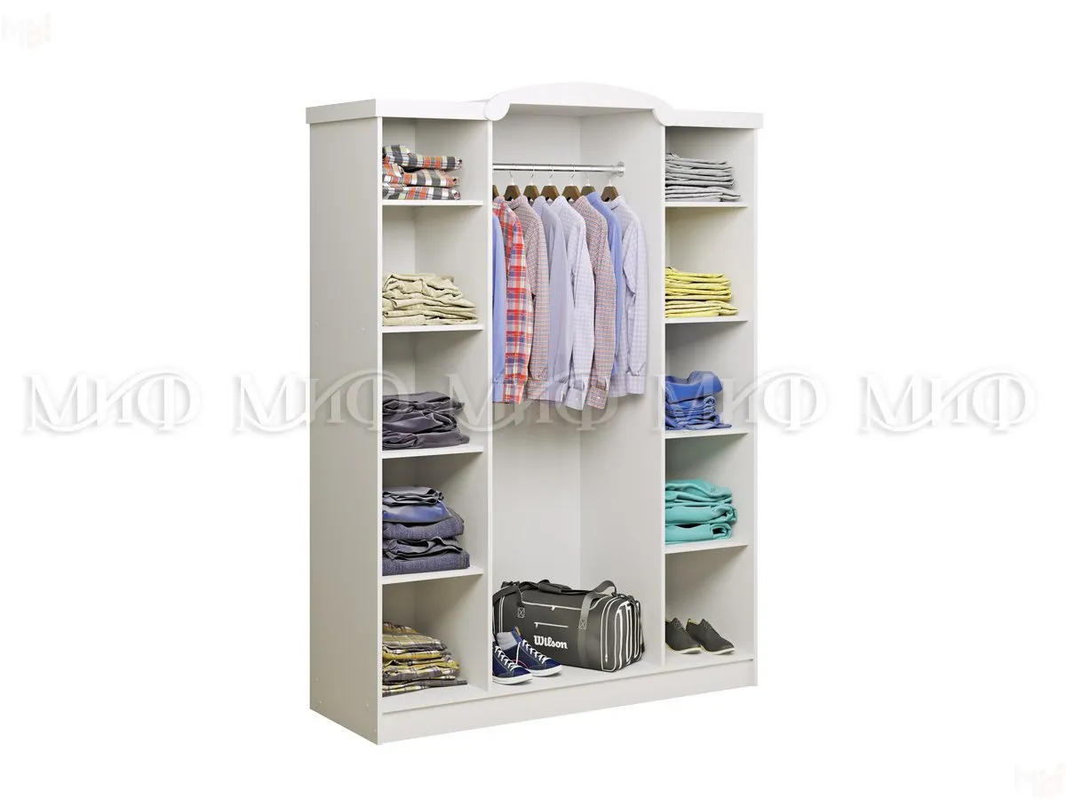 Каркас шкафа выполнен из ЛДСП белого цвета, фасады МДФ белый глянец. Наполнение шкафа - в боковых секциях полки для белья, в средней части штанга для верхней одежды.