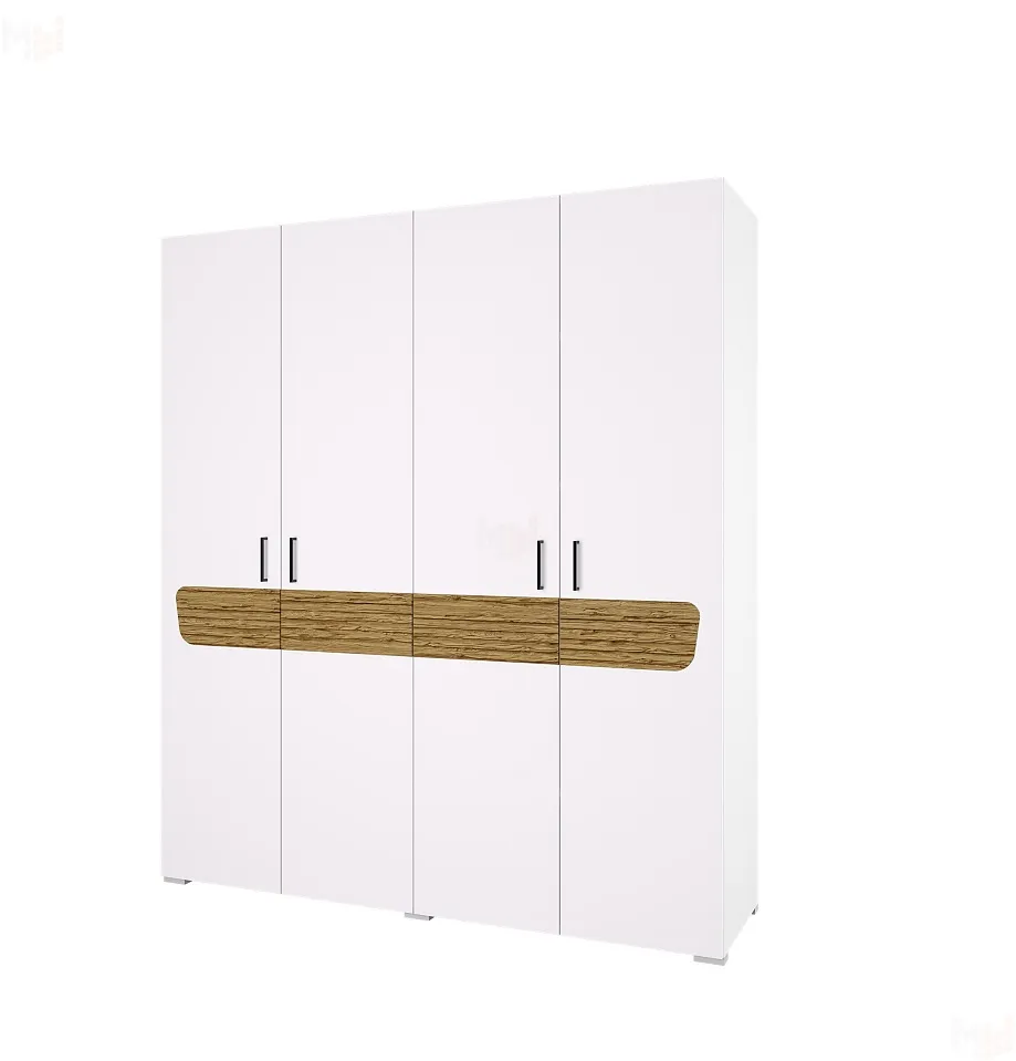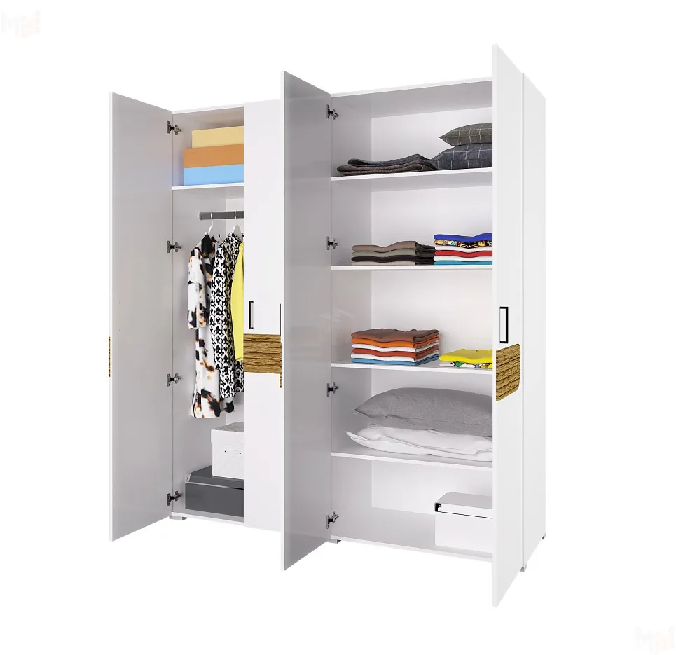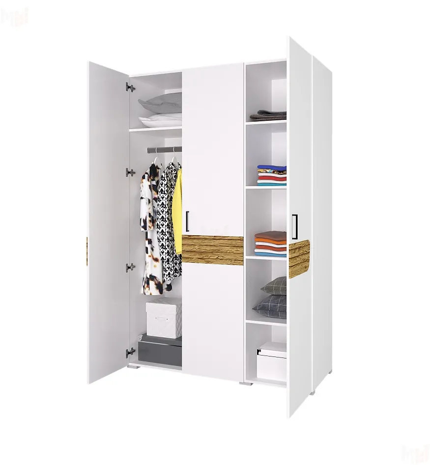 Корпус шкафа выполнен из ЛДСП белого цвета. На фасадах вставки МДФ Дуб золотой.