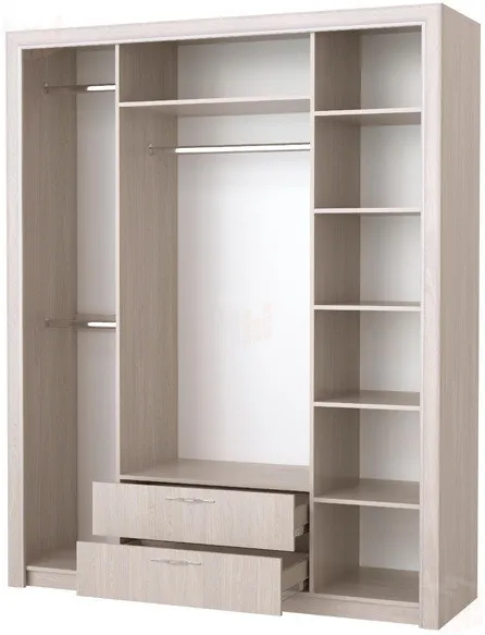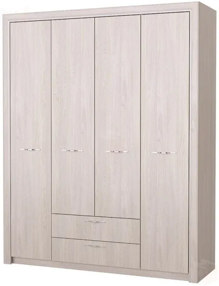 Шкаф 4С2Я "Октава" 4-створчатый с ящиками, с полками для белья и поперечными металлическими штангами для одежды. Устанавливается стильная металлическая ручка, декор "тёмный никель". Периметр шкафа обрамлён профилем MDF оригинальной формы с патиной (окраской фасок) серебристого цвета. Направляющие шариковые, полного выдвижения. Опционально можно доукомплектовать зеркалами.