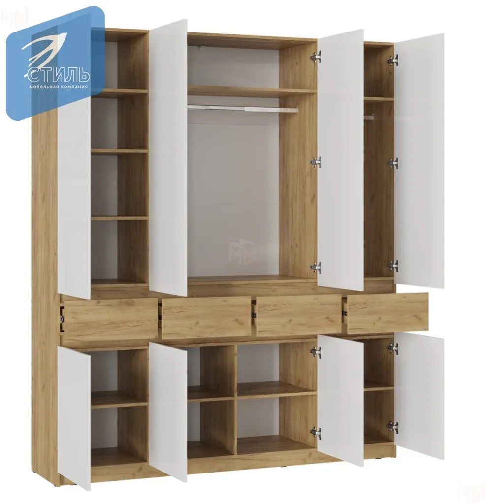 • Шкаф имеет две металлических штанги под одежду, а так же множество вместительных полок.