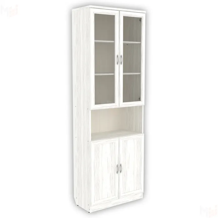 Книжный шкаф 207, шкаф разделен на две части: верхнюю и нижнюю, между которыми находится дополнительная полочка. Верхняя часть спроектирована с четырьмя полками, которые абсолютно одинаковы как площадью, так и по расстоянию. Полочки закрыты стеклянной дверью.