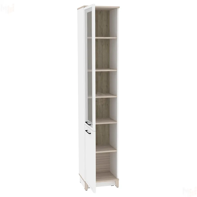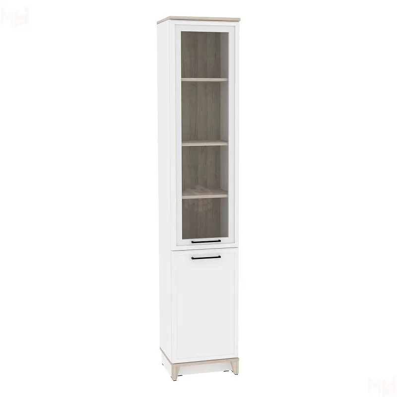 Неглубокий (355 мм) шкаф для книг позволяет разместить любимые книги за прозрачным стеклом, а архив за глухим фасадом. Изысканность стиля подчеркивает тонкий фигурный профиль на фасадах, верх и низ модулей выполнены в древесном декоре, а скошенные опоры из МДФ добавляют мебели в стиле неоклассика из коллекции AURELIO нотку современной эстетики.
