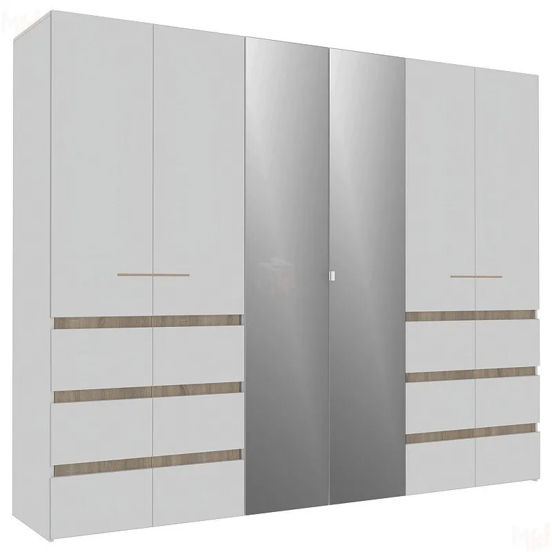 Глубокий распашной шестидверный шкаф для одежды и белья с зеркалами с чёткой организацией внутреннего пространства обеспечивает комфортное хранение вещей всей семьи. Конструктивом Шкафа предусмотрены: отделение для хранения белья с регулируемыми по высоте полками и 2 отделения для одежды со стационарной штангой.