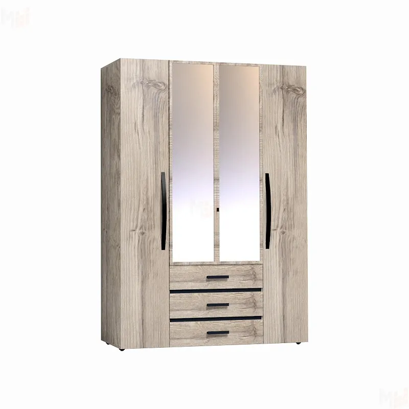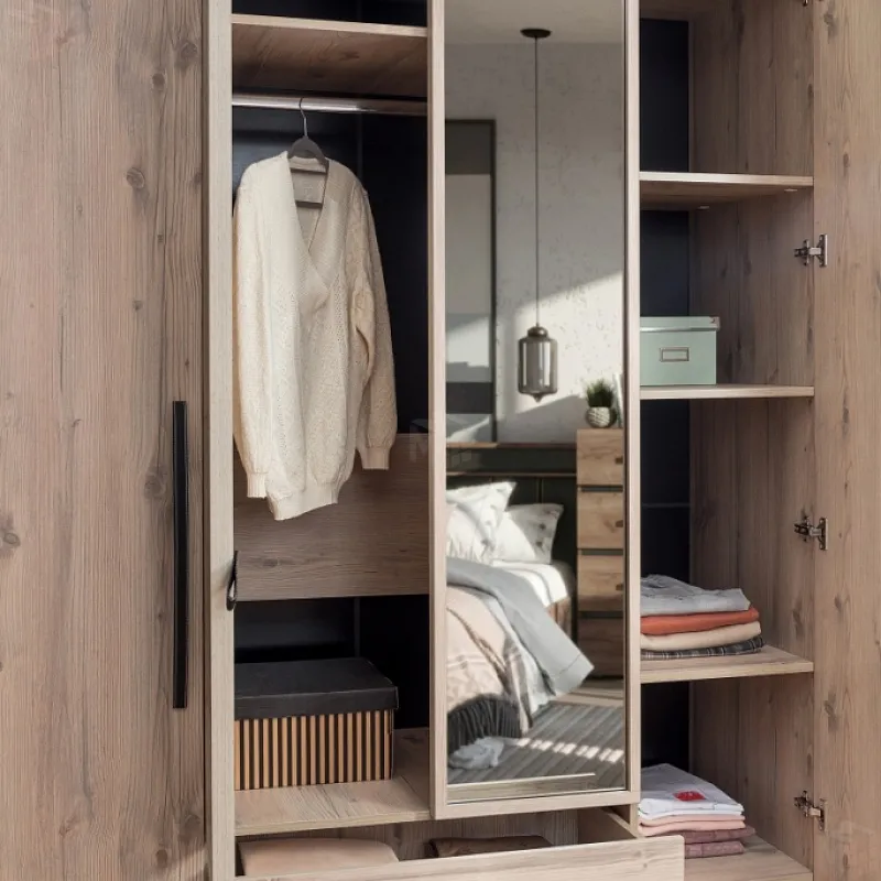 Вместительный распашной шкаф красивого древесного оттенка с 2-мя зеркальными фасадами прекрасно подойдет в небольшую спальню. Функциональное наполнение шкафа разделено на две симметричные половины, что очень удобно для пользования и зонирования гардероба всех членов семьи. За глухими фасадами скрываются отделения с 4 полочками, регулируемых по высоте, что делает хранение одежды и аксессуаров крайне удобным. Зеркальные фасады шкафа обрамлены вставками из ЛДСП. Изнутри зеркало покрыто специальной защитной пленкой, которая предотвратит падение осколков, если оно разобьется. Элегантная ручка-петля позволит открывать дверцу, не прикасаясь к зеркальному полотну, а, значит, его не придется часто протирать.