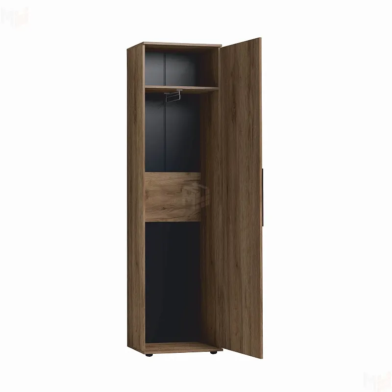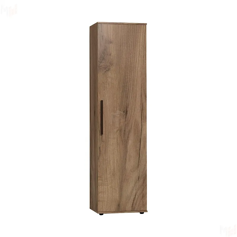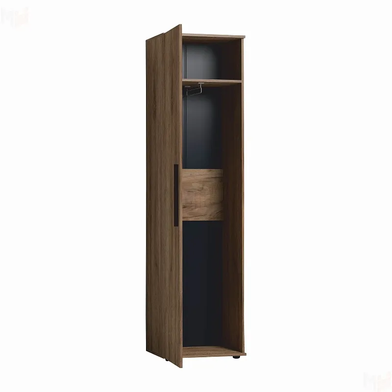 Распашной шкаф в декоре Дуб Табачный комплектуется штангой для одежды и полкой. Выдвижная штанга выдерживает нагрузку до 10 кг. К модулю Nature 71 можно докупить и установить Полки Nature 19 (в комплекте 3 полки) в заранее просверленные варианты присадки. Для удобства использования шкаф может собираться как на левую, так и на правую сторону.