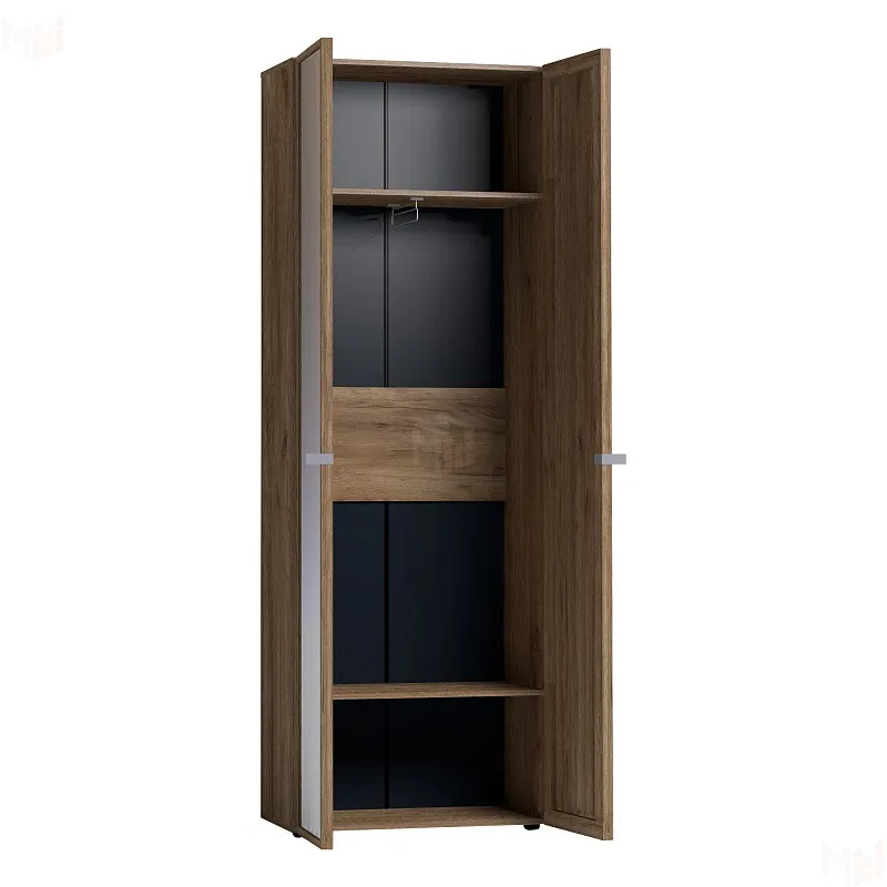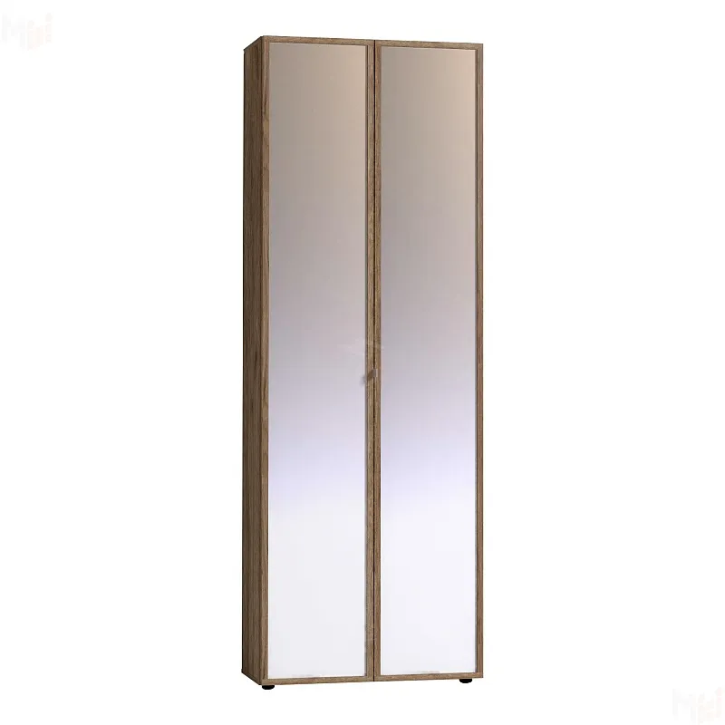 Двухдверный распашной шкаф легко открывается за ручку-петлю из микрофибры, которая устанавливается на одном зеркальном фасаде, другой - открывается за рамку. Шкаф комплектуется выдвижной штангой и двумя нишами сверху и снизу. Корпус шкафа выполнен в декоре Дуб Табачный. Регулируемые опоры компенсируют неровности пола.