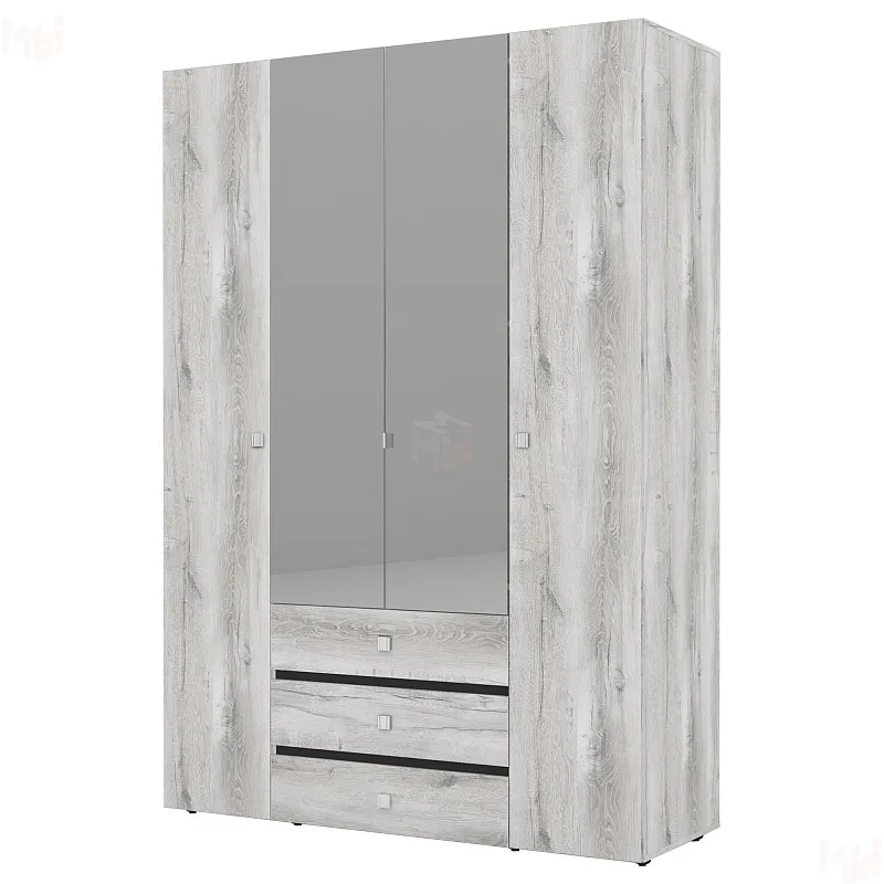 Вместительный распашной шкаф красивого древесного оттенка с черными вставками из ЛДСП и металлической фурнитурой, прекрасно подойдет в спальню в стиле лофт. Функциональное наполнение шкафа разделено на две симметричные половины, что очень удобно для пользования и зонирования гардероба всех членов семьи. За глухими фасадами скрываются отделения с 4 полочками, регулируемых по высоте, что делает хранение одежды и аксессуаров крайне удобным. За зеркальными фасадами шкафа закреплена стационарная штанга (777 мм), которая выдержит нагрузку в 40 кг.