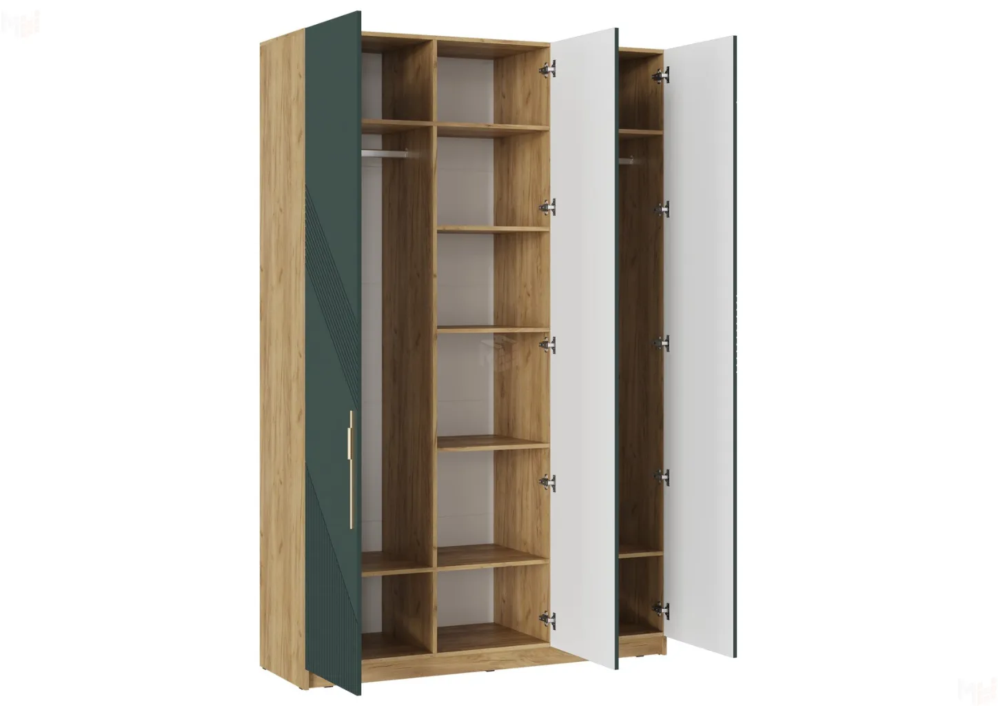 - Шкаф "Коста" имеет три распашные двери, за которыми скрываются полки и две металлические штанги для одежды.