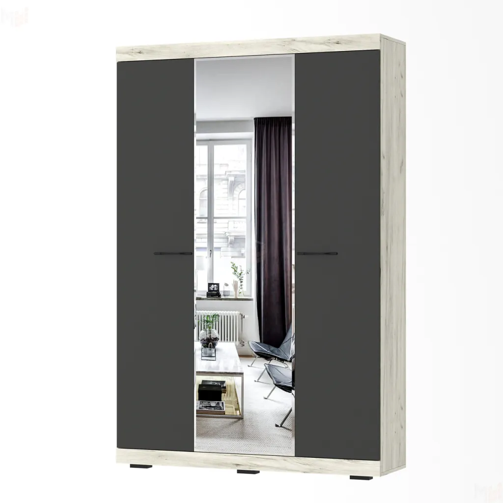 Шкаф "СОНАТА" ШСЗ-1300 трёхстворчатый с зеркалом, с полками и выдвижной штангой для верхней одежды. Устанавливается стильная металлическая ручка, чёрная, матовая. Верхняя и нижняя части шкафа обрамлёны профилем MDF. Зеркало выполнено с изящной и красивой обработкой "фацет" по периметру. -