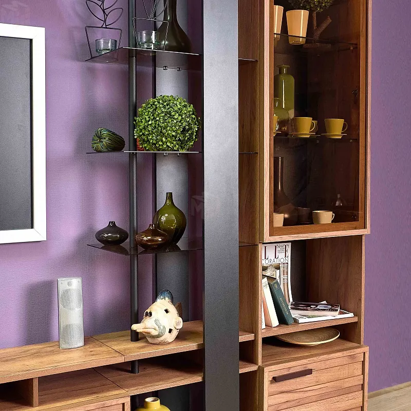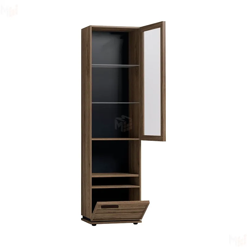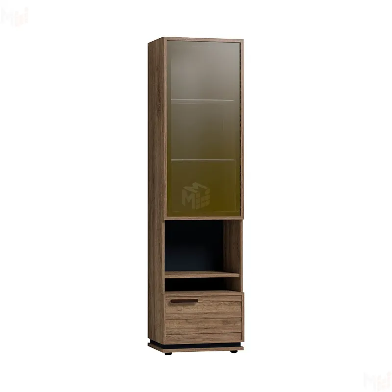Высокий шкаф для посуды удобен своей функциональностью и эргономичностью конструкции. За тонированным стеклянным фасадом - 2 регулируемые по высоте бесцветные стеклянные полки. Витрина открывается за боковой свес. На открытой полке разместите фотографии или элементы декора, а за глухим откидным фасадом спрячьте документы и ценные вещи от посторонних глаз. Регулируемые опоры шкафа позволят компенсировать незначительные неровности пола.