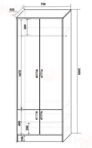 Состоит из нижнего ящика с полкой посередине и верхнего гардероба. Внутреннее наполнение состоит из верхней полки и металлической штанги для вешалок.