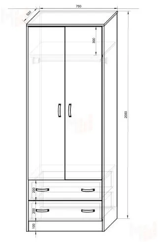 Модуль двухдверный. Универсальный. Состоит из двух выдвижных ящиков для белья или обуви и верхней гардеробной секции (внутреннее наполнение - металлическая штанга и верхняя полка).