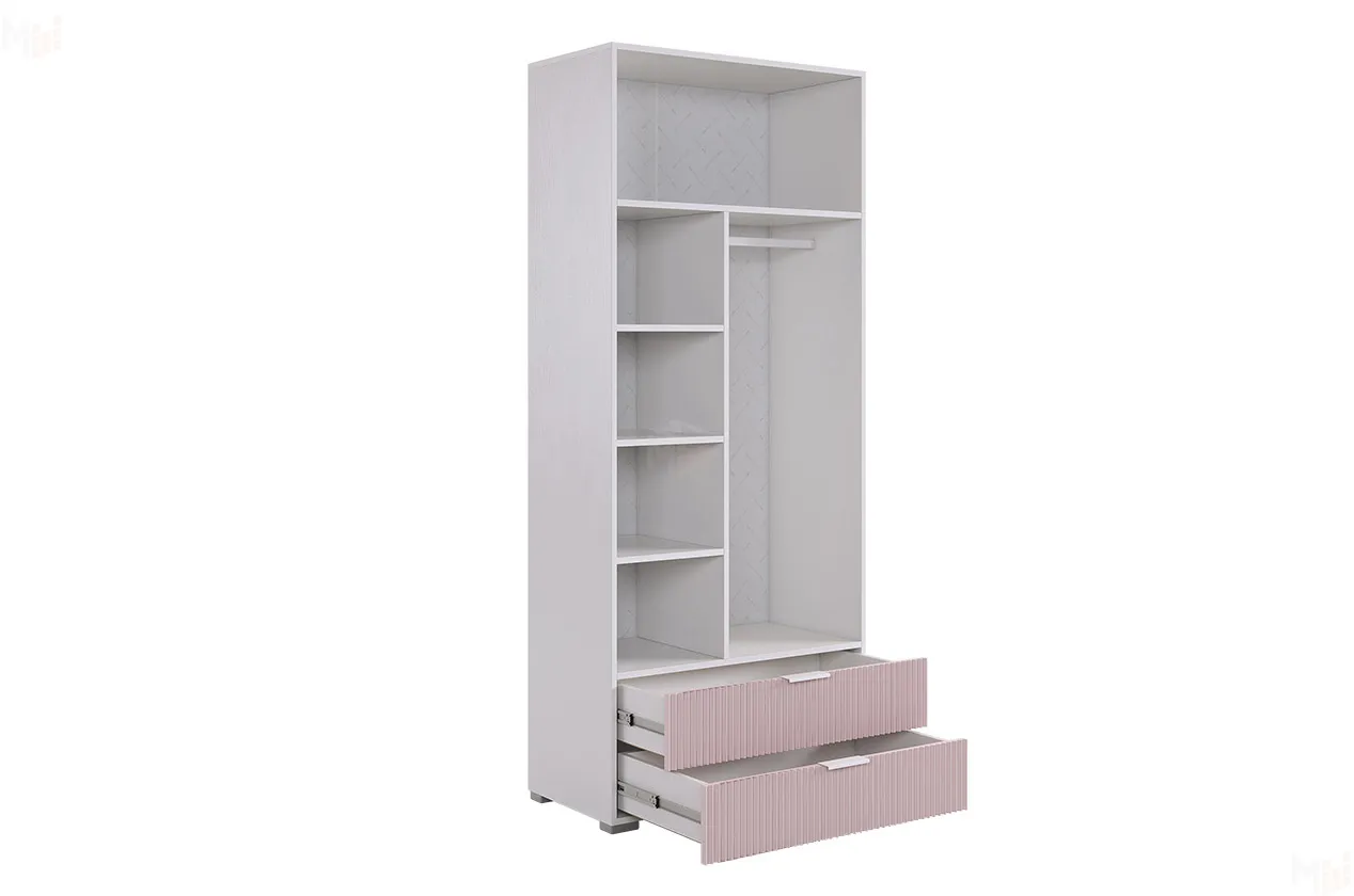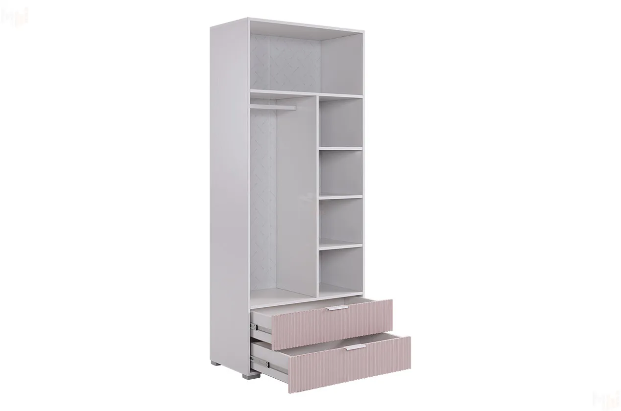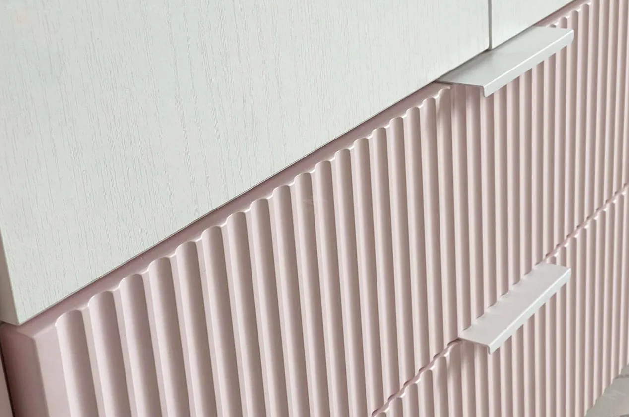 Шкаф изготовлен из лдсп в белом цвете, что придаст помещению светлую и уютную атмосферу. Фасады выполнены из мдф, покрытие эмаль цвета пудра розовая. Вертикальные полосы на фасаде создают особую изысканность и стильный акцент, добавляя глубины пространству.
