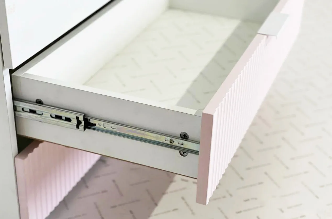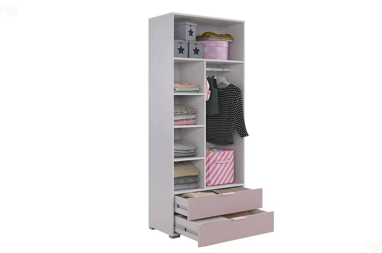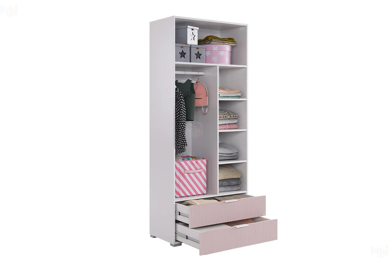 Шкаф изготовлен из лдсп в белом цвете, что придаст помещению светлую и уютную атмосферу. Фасады выполнены из мдф, покрытие эмаль цвета пудра розовая. Вертикальные полосы на фасаде создают особую изысканность и стильный акцент, добавляя глубины пространству.