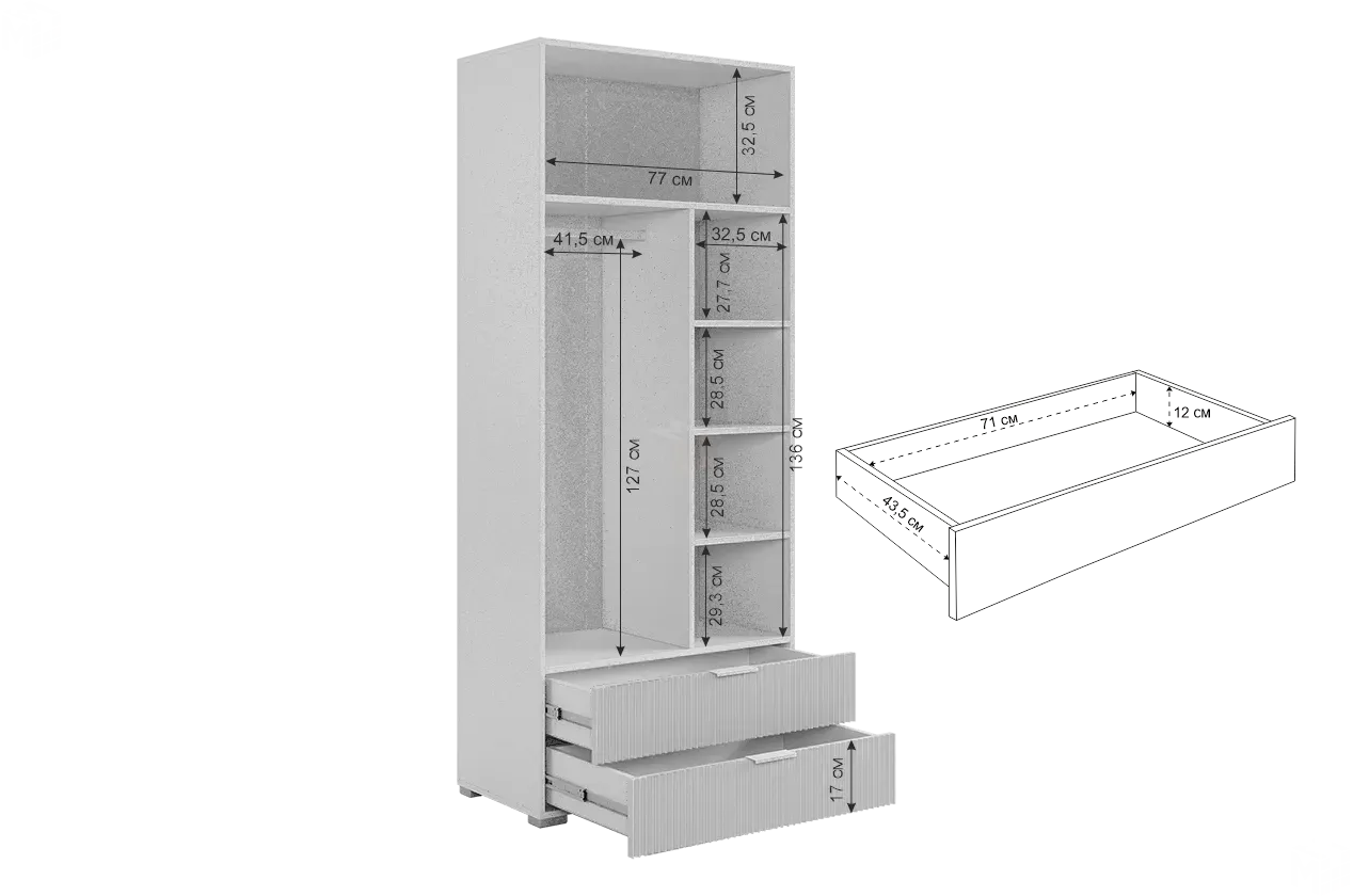 Удобное и практичное наполнение шкафа включает одну общую верхнюю полку и секцию со штангой для одежды, а также дополнительные полки. Это позволяет разделить пространство так, чтобы все предметы были удобно и компактно размещены.