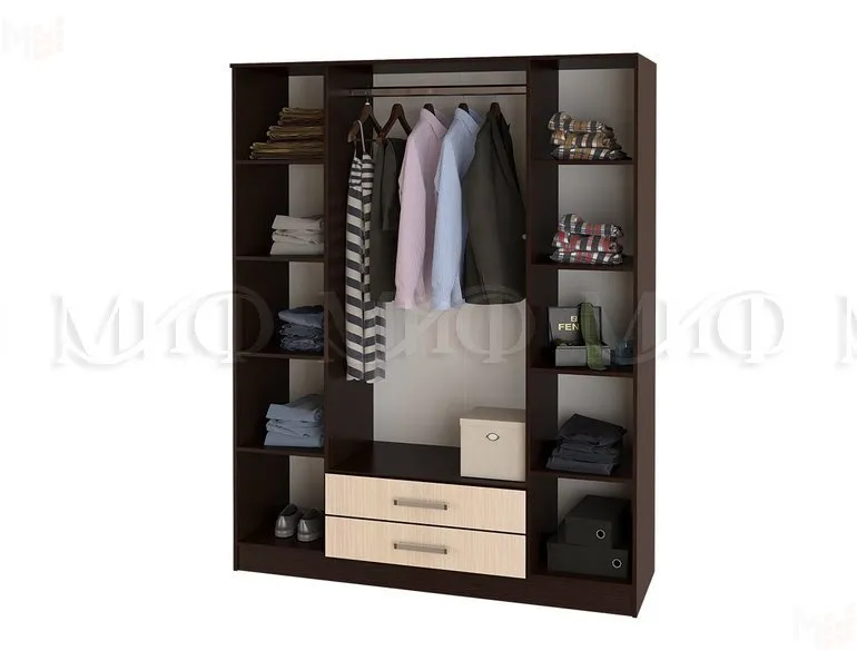 В боковых секциях разместились отделения с полками, в центральной части за распашными дверками штанга для одежды.