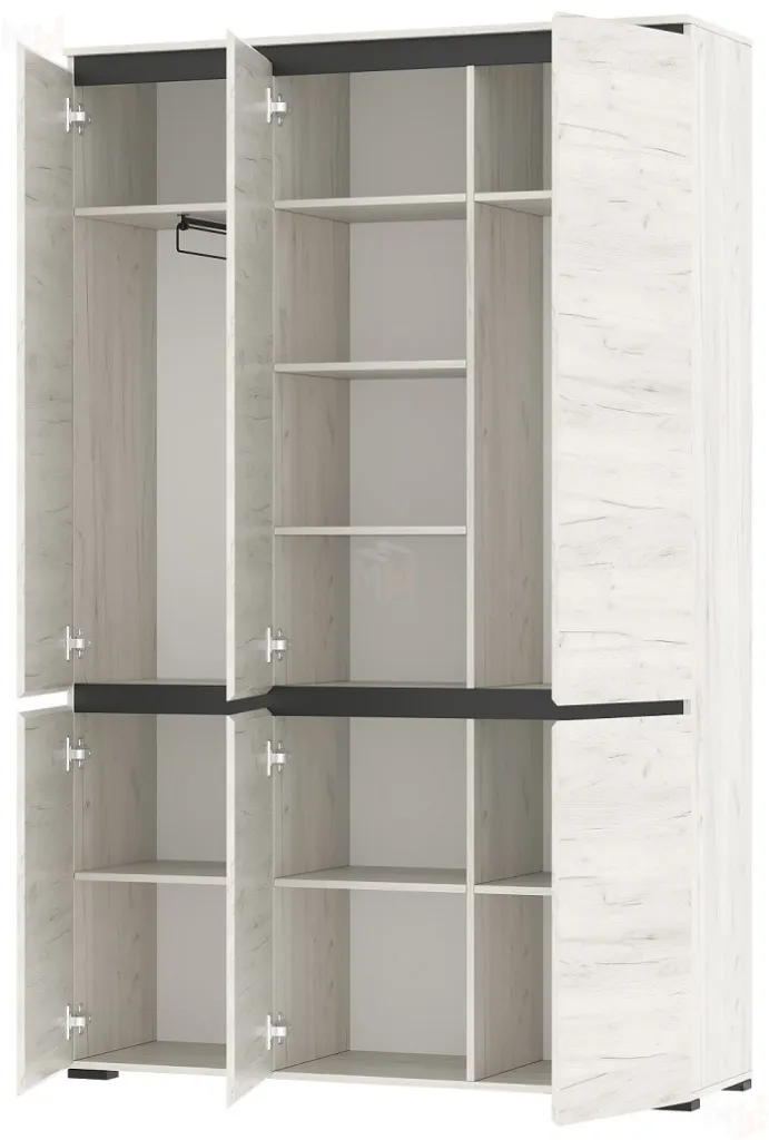 Шкаф 4С2ЗР "ГРЕТТА" 6-створчатый, с поперечной металлической штангой для верхней одежды, с полками. Применение интегрированной ручки на фасадах делает модель стильной и безопасной – дверцы открываются за профилированные выступы. Фасады обработаны кромкой 1 мм. Чёрная регулируемая ножка-опора.