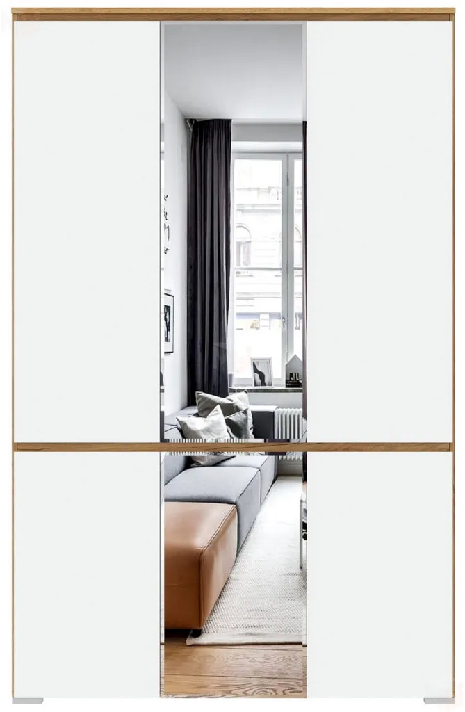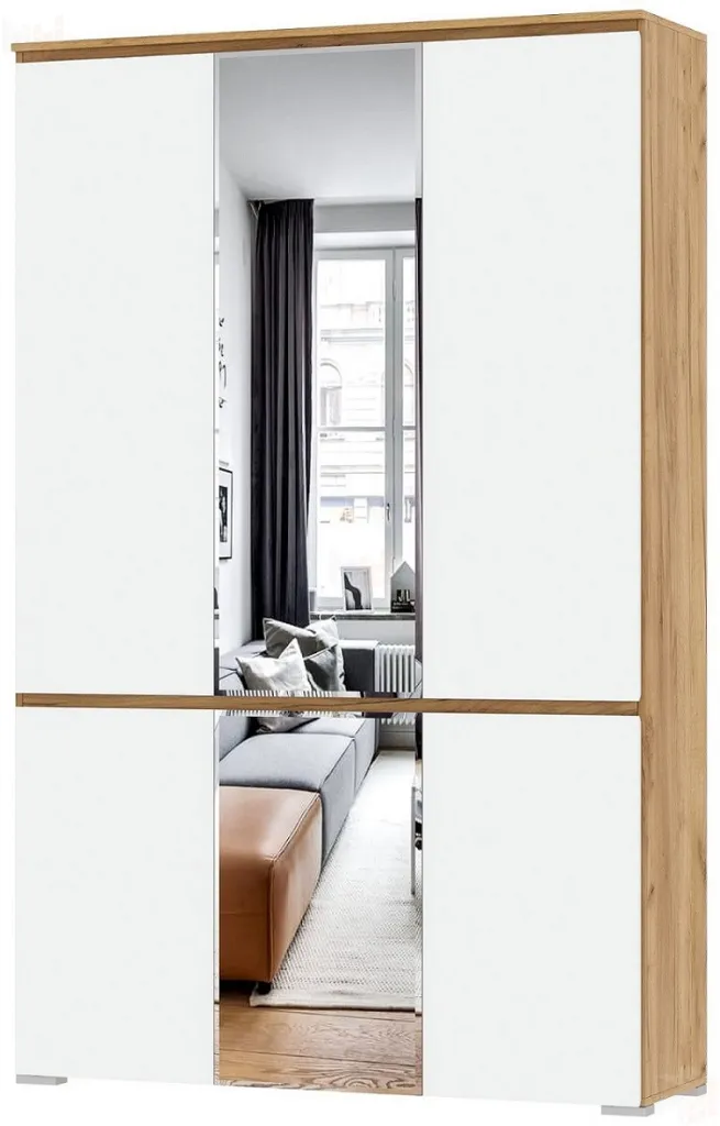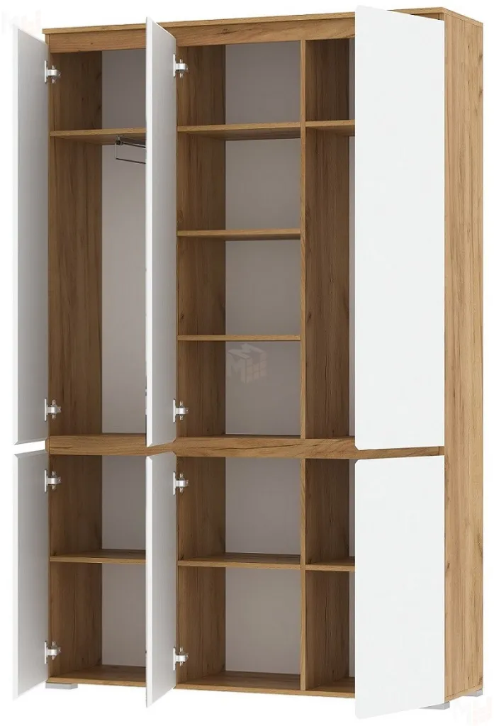 Шкаф 4С2ЗР "ГРЕТТА" 6-створчатый, с поперечной металлической штангой для верхней одежды, с полками. Применение интегрированной ручки на фасадах делает модель стильной и безопасной – дверцы открываются за профилированные выступы. Фасады обработаны кромкой 1 мм. Чёрная регулируемая ножка-опора.