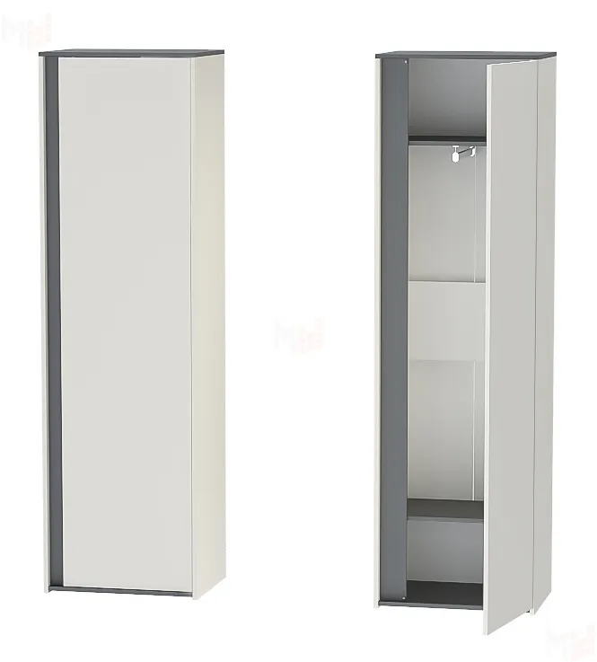 За распашной створкой находятся: две полки и поперечная штанга для одежды.
