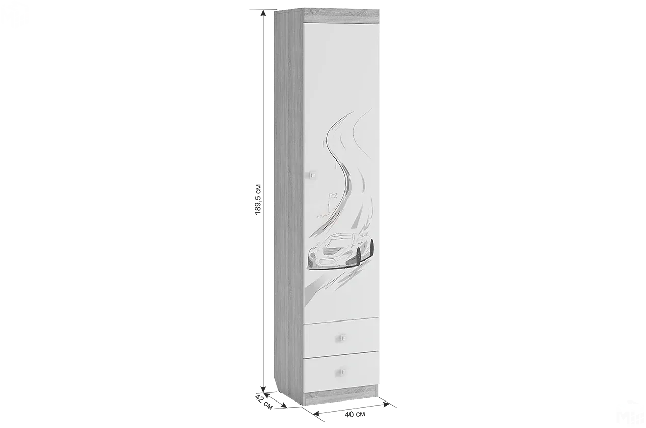Вместительный шкаф «Форсаж» – мечта каждого мальчика. Штанга для одежды и 2-а выдвижных ящика для белья - отличное решение для детской. Эффектный принтерный рисунок на фасадах выдержан в общем стилистическом решении. Рисунок устойчив к истиранию и ультрафиолету.