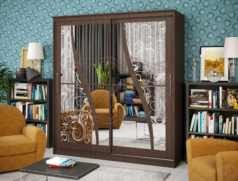 Шкаф Элегант №2 разделен на несколько частей. В одной есть штанга для одежды, в другой полки для белья, выдвижные ящики. Двери шкафа декорированы фигурными зеркалами с пескоструйным рисунком. Варианты цвета корпуса - венге, дуб сонома, ясень шимо темный.