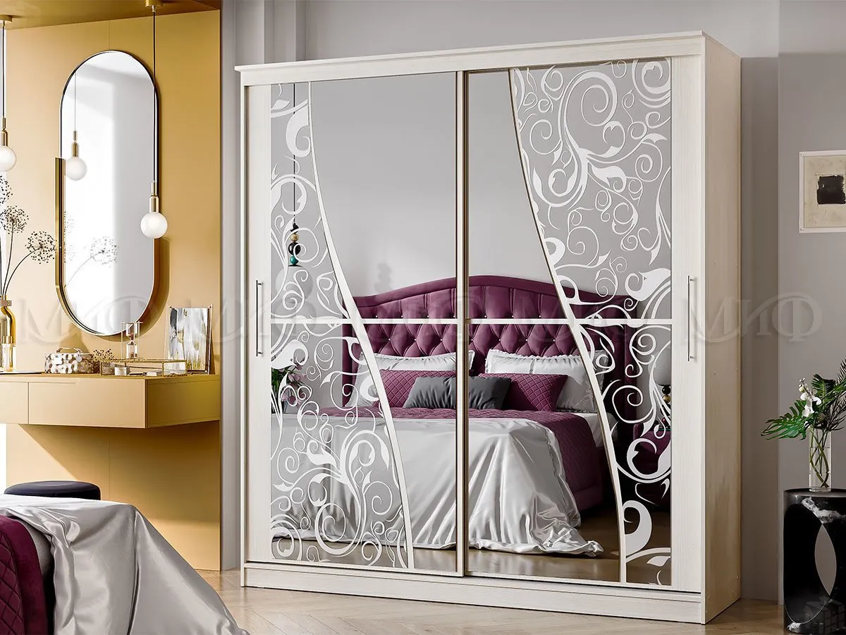 Шкаф Элегант №2 разделен на несколько частей. В одной есть штанга для одежды, в другой полки для белья, выдвижные ящики. Двери шкафа декорированы фигурными зеркалами с пескоструйным рисунком.