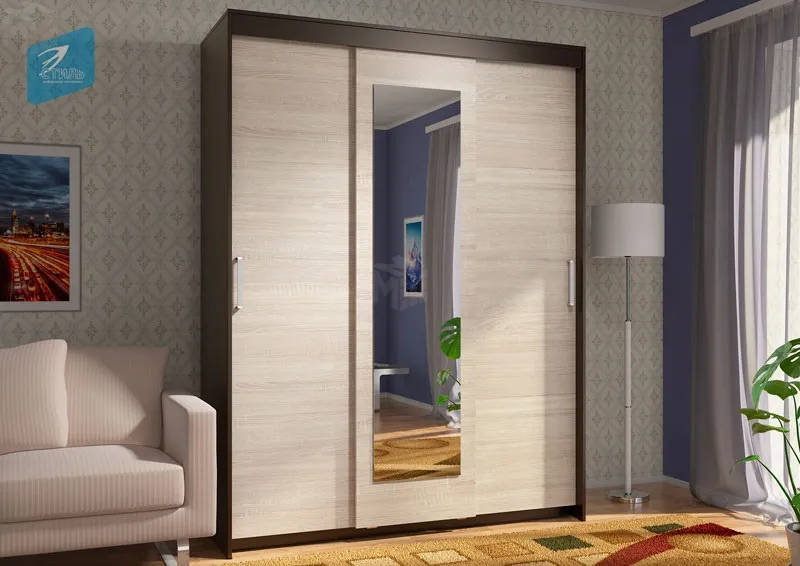 Полезная глубина шкафа-купе Эва ШК-016 составляет 490 мм, что даёт возможность вешать одежду в полную глубину. Шкаф-купе состоит из расположенного в левой части отделения с 4мя полками шириной 484мм., расстояние между которыми около 390мм., и отделения со штангой, такой-же ширины что и в 2х створчатом шкафе, для верхней одежды и полкой, глубиной 298мм. (для шапок) над ней, высота от полки до крыши шкафа 382 мм. расстояние от нижней вязки до штанги 1500 мм. На центральном фасаде располагается зеркало, достаточного размера для того, чтобы смотреться в полный рост, а горизонтальная текстура имеет свойство визуально растягивать пространство делая шкаф более объёмным при своём достаточно-компактном размере. Раздвижная система СТ-148 – имеет подвесной характер. Верхняя направляющая изготовлена из металла, это увеличивает долговечность работы системы, так как вся нагрузка распределяется на ней, а её Ш-образная форма исключает возможность выпадение створок во время эксплуатации. С лицевой части верхняя направляющая скрыта декоративной планкой. Легкое перемещение дверей и плавность хода обеспечивается за счет ходовых роликов, расположенных в верхней части створок. Фиксация створок в нижней части достигается благодаря уголкам передней и задней дверей с ползункам, зафиксированных в ходовом профиле. Цвет корпуса венге, фасад ЛДСП дуб сонома светлый. Зеркало 4 мм. Для изготовления Шкафов-купе Эва используются только экологически чистые материалы