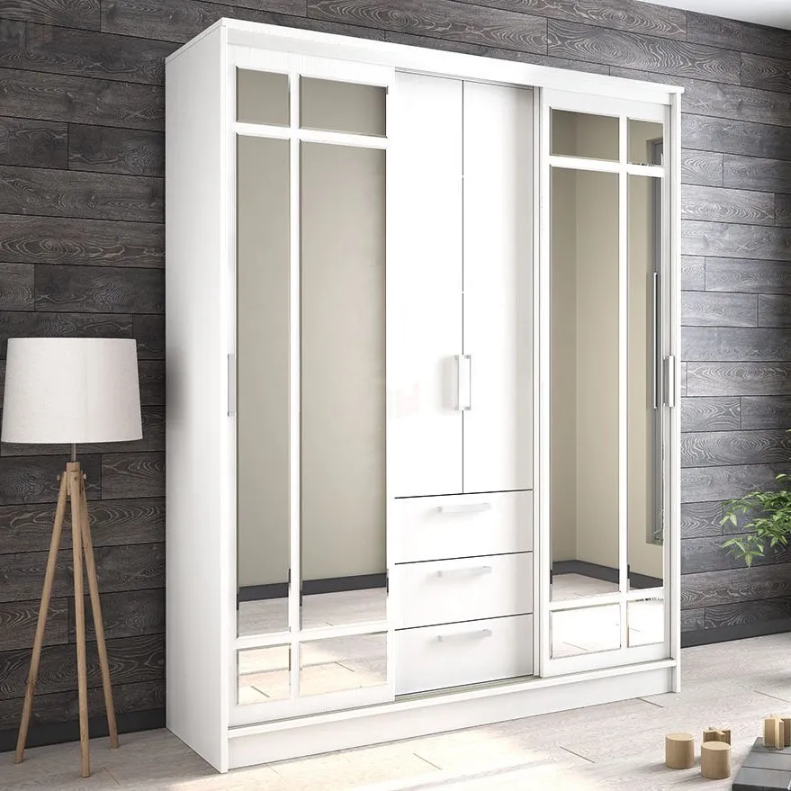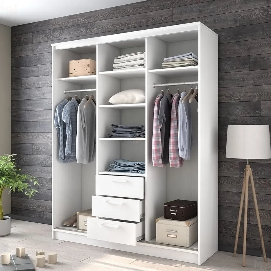 Каркас выполнен в темном цвете, приближенном к оттенку натуральной древесины. Раздвижные двери шкафа выполнены в контрастном белом цвете, что делает этот предмет мебели изысканным и стильным.