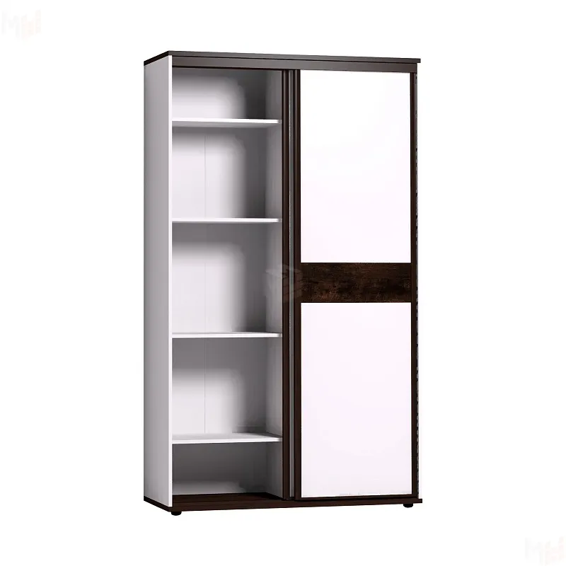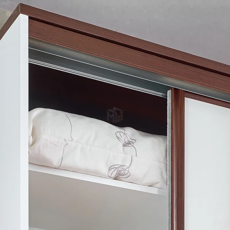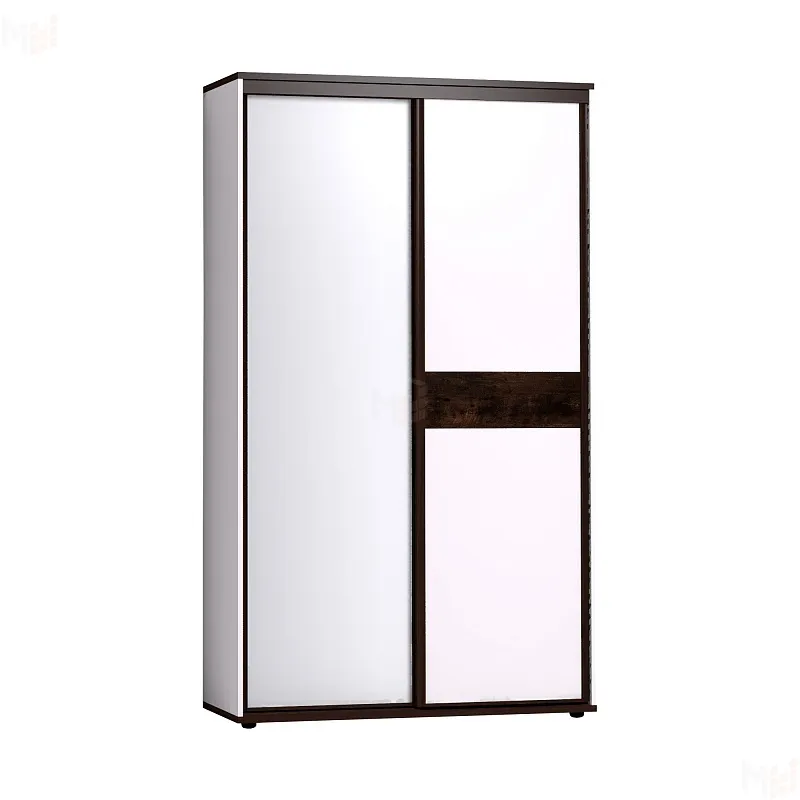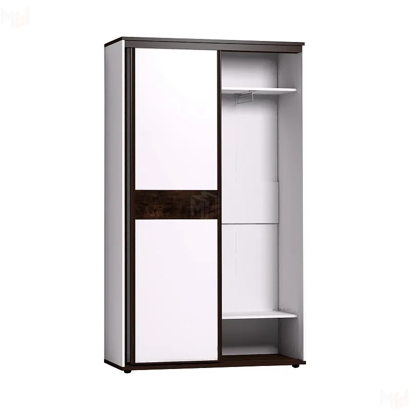 Небольшой шкаф-купе в прихожую с продуманным внутренним наполнением позволяет рационально использовать площадь небольшого коридора в квартире. В комплектацию шкафа входят: выдвижная штанга и регулируемые по высоте полки для одежды. Два фасада - зеркальный и глухой - перемещаются на стальной системе Найди, которая обеспечивает легкость открывания, плавность и бесшумность хода. Зеркальный фасад проклеен с обратной стороны защитной пленкой. Шкаф-купе создан на контрасте: белый корпус, белый глухой фасад и декоративная вставка и горизонтальные детали в декоре Орех Шоколадный, трек и профили цвета венге. Регулируемые опоры компенсируют незначительные неровности пола
