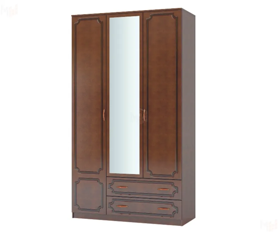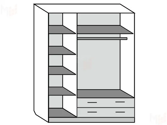Наполнение шкафа - штанга для одежды, два выдвижных ящика, с левой стороны полки для белья. Корпус шкафа из ЛДСП орех, фасады МДФ.