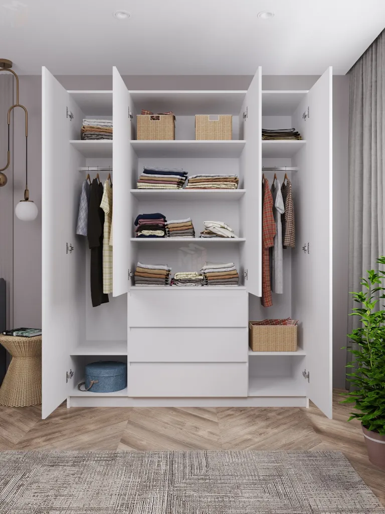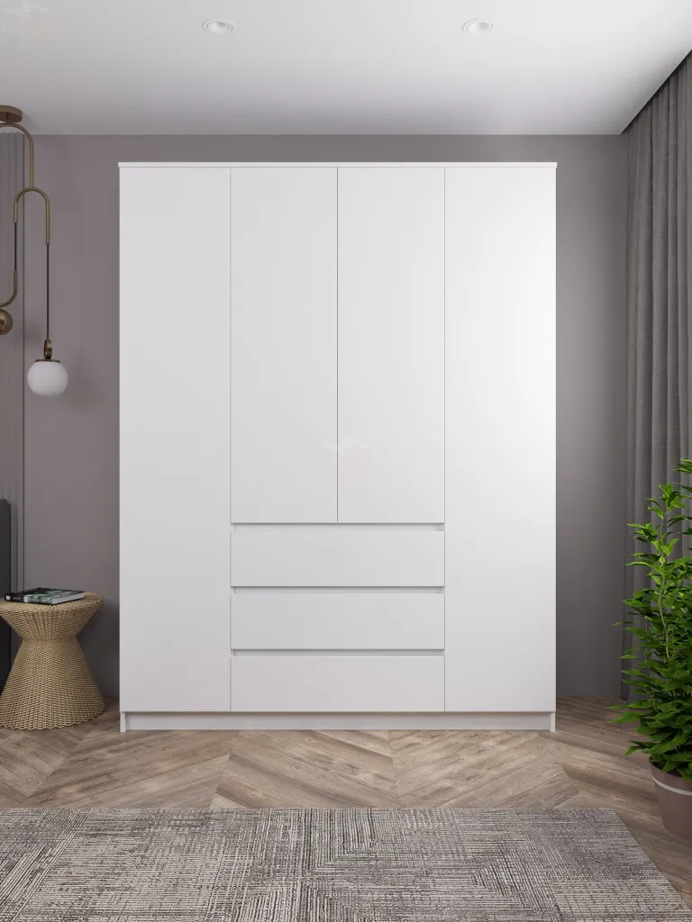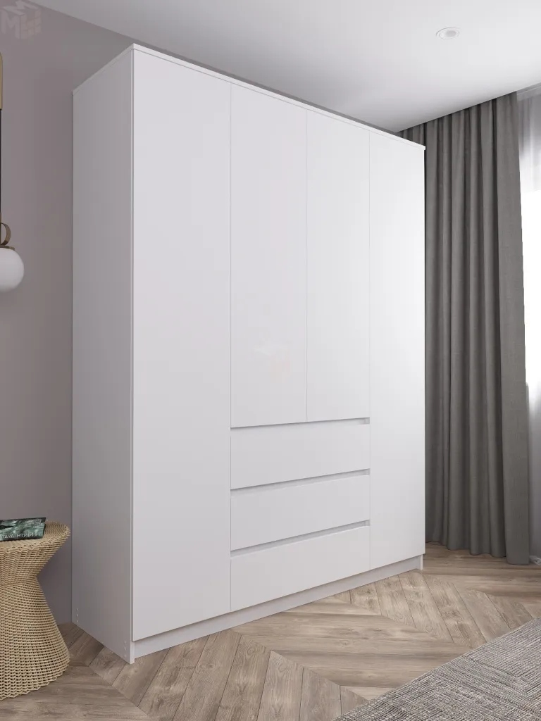 Белый распашной шкаф «Мори» станет отличным выбором для спальни или детской комнаты. Он оборудован полками для хранения белья, штангами для вешалок и выдвижными ящиками на роликовых направляющих.
