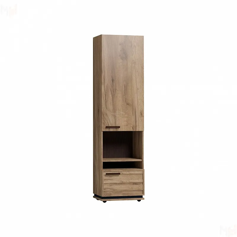 Благородный древесный оттенок шкафа, контрастирующий с черными ручками из массива дерева, подойдет к большинству цветовых решений – мебель будет легко комбинировать с другими предметами. Высокий шкаф МЦН удобен своей функциональностью и эргономичностью конструкции. На открытой полке разместите фотографии или элементы декора, а за глухими фасадами спрячьте документы и ценные вещи от посторонних глаз. Регулируемые опоры шкафа позволят компенсировать незначительные неровности пола.