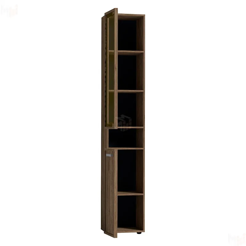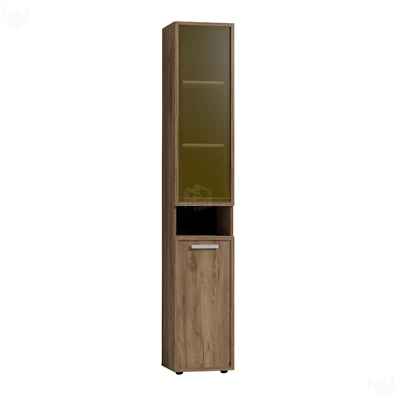 Высокий шкаф для хранения идеально подходит для комнаты подростков, в которой слишком много разнообразных и таких "нужных вещей". Верхний рамочный фасад с тонированным стеклом открывается за раму, нижний фасад Контур открывается за серую ручку из массива. Верхний и нижний фасады можно перенавесить на левую и на правую стороны