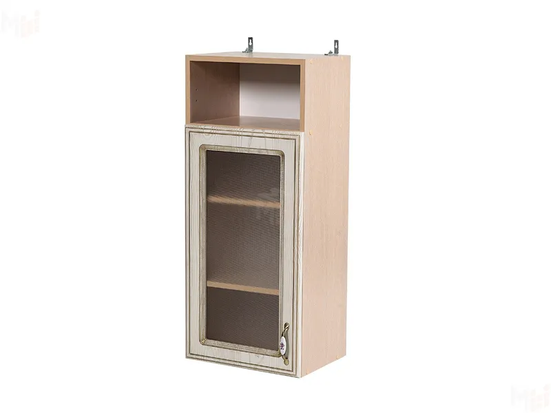 Шкафчик навесной кухонный узкий с полочкой-нишей декорированной балюстрадой, стеклянными дверками. Две внутринние полочки.