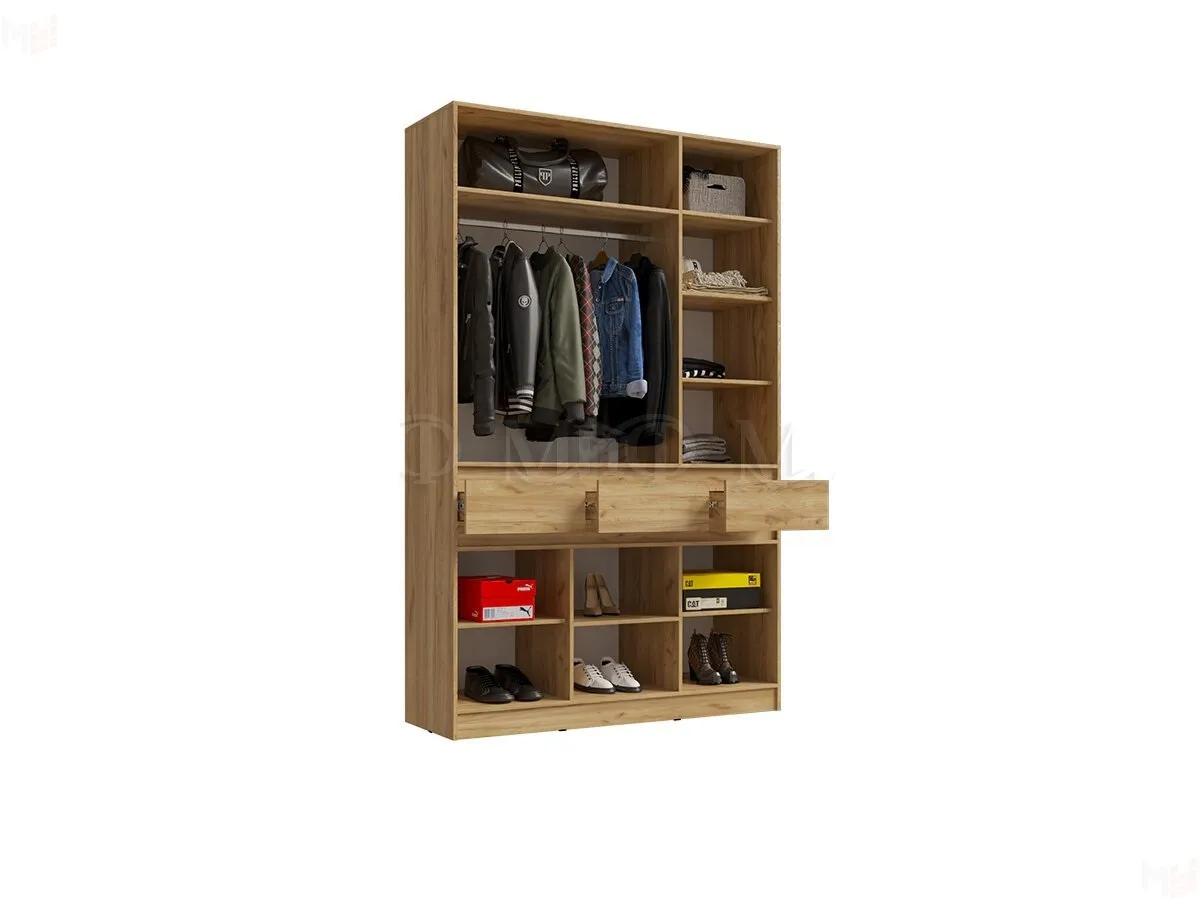Этот высокий, вместительный и в то же время компактный шкаф будет великолепно смотреться в тандеме с прихожей Роджина. Помимо объемного отсека под одежду с металлической штангой, в шкафу Роджина предусмотрено два удобных выдвижных ящика на шариковых направляющих, а также четыре полки небольшого размера и большая верхняя полка-антресоль.