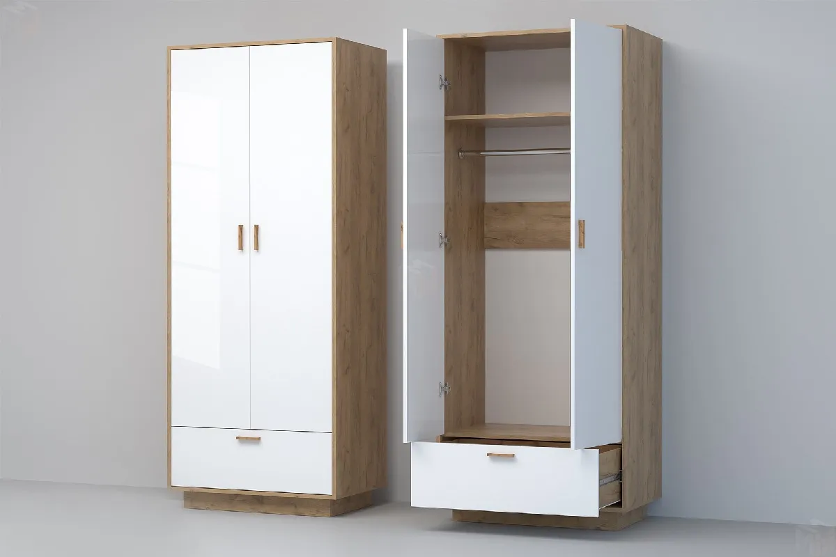 Шкаф имеет две распашные дверки и выдвижной ящик на шариковых направляющих полного выдвижения.