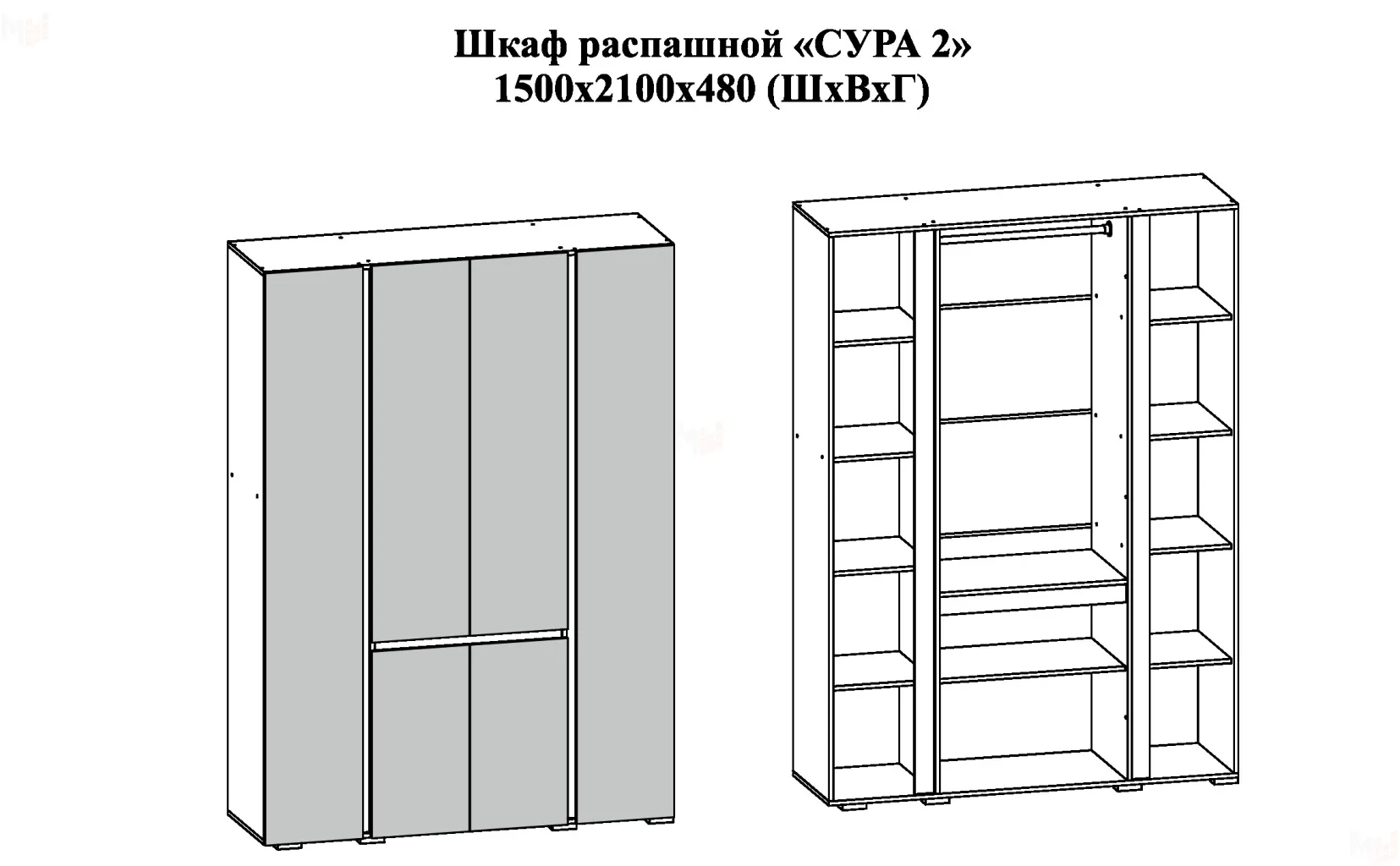 ширина 1500 мм, глубина 490 мм, высота 2100 мм