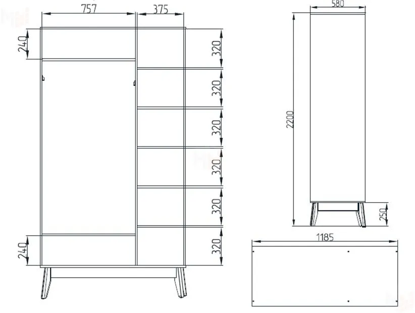 ширина 1185 мм, глубина 580 мм, высота 2200 мм