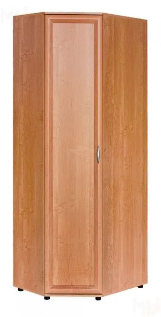 Шкаф угловой с одной дверью выполнен из ЛДСП, фасад декорирован рамкой МДФ. Наполнение шкафа - с одной стороны полки для белья, с другой стороны штанга для одежды.
