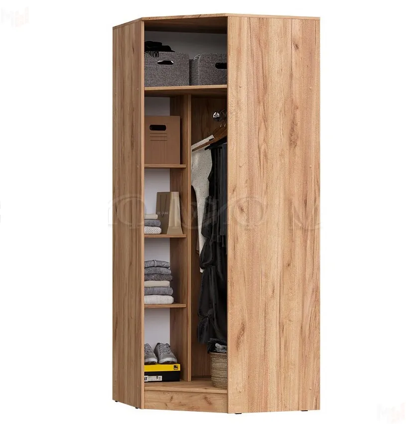 Шкаф угловой Мартина оснащен полками для белья и штангой для одежды.