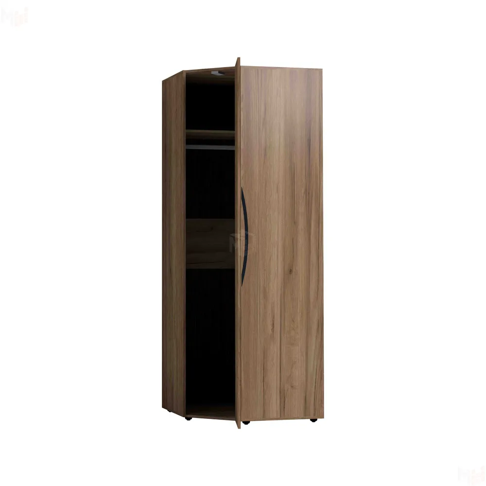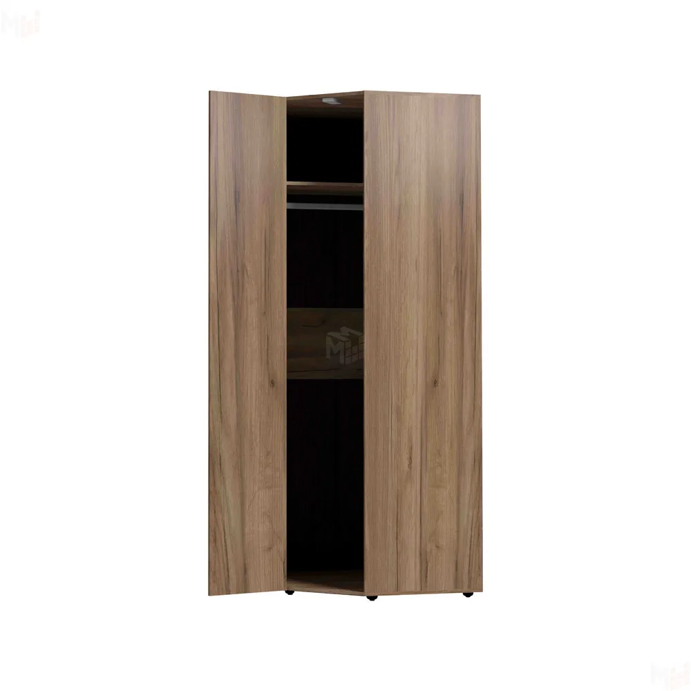 Отлично организовать пространство в маленькой спальне поможет угловой шкаф. Гладкие фасады и натуральный декор шкафа привнесут в комнату особый уют и теплоту. Стационарная штанга и полноценный стеллаж для белья внутри способствуют аккуратной организации вещей. Шкаф оснащен беспроводным светодиодным светильником, который включается при открывании двери. Это особенно удобно, если нужно найти в шкафу вещи, не потревожив близких. Легкая установка на магнитное крепление - не требует сверления, прокладывания провода, подключения к сети. Шкаф обязательно крепится к стене на подвесы, а компенсировать неровности пола можно, благодаря регулируемым опорам.