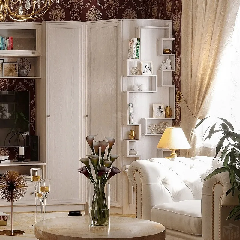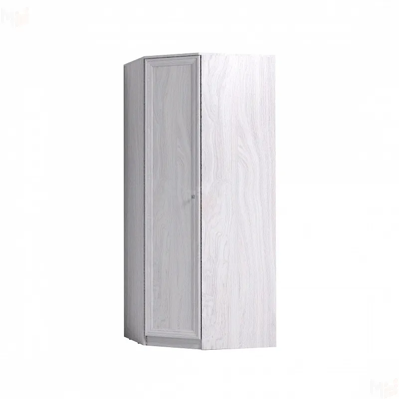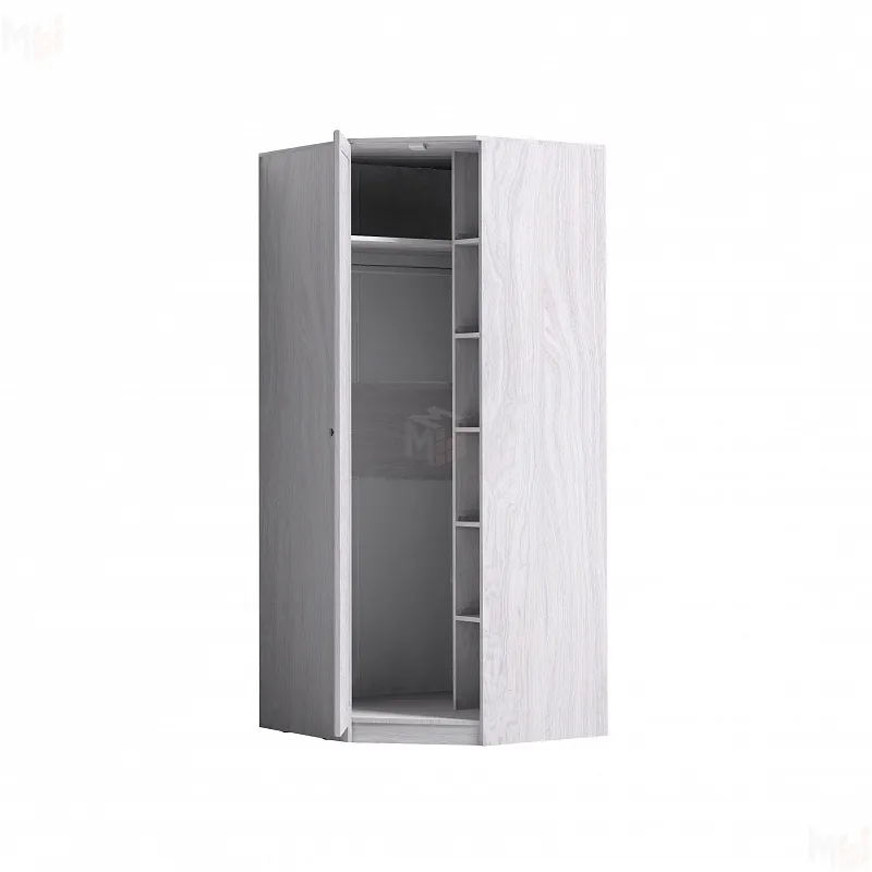 Рационально и удобно разместить одежду и белье поможет угловой шкаф. Благодаря своей форме и расположению в комнате он занимает мало места и делает комнату более просторной. А используемый декор Ясень Анкор светлый придаст комнате эффект легкости и невесомости. Угловой шкаф оснащен стационарной штангой длиной 851 мм, полочками для белья и автоматической подсветкой, которая включается, если шкаф открыт. Пять полочек, регулируемых по высоте способны выдержать нагрузку до 6 кг, а стационарная штанга позволит разместить в шкафу до 13 плечиков с верхней одеждой.